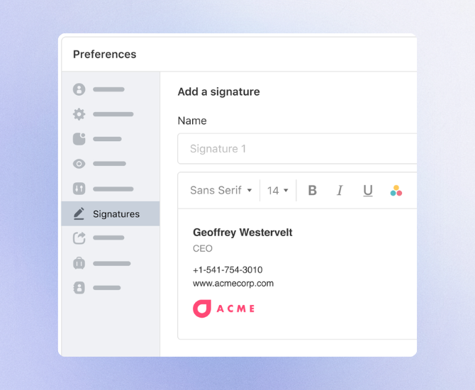 Easily design custom email signatures with your contact details, company logo, and important links.